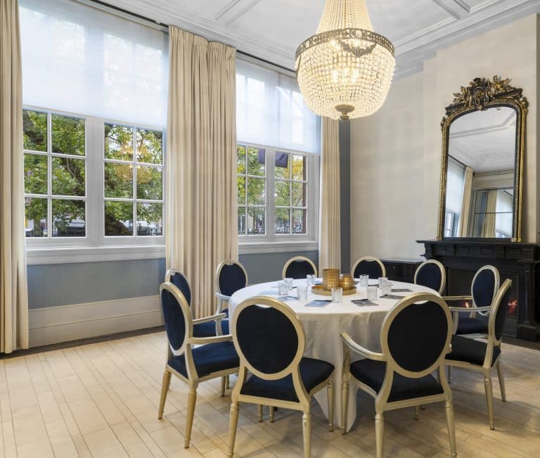 De Coster Salon in The College Hotel is een ruimte met veel daglicht, een chique spiegelwand en, centraal in de ruimte, een sfeervolle open haard. In verschillende opstellingen biedt de Coster Salon ruimte om 12 gasten te verwelkomen voor een vergadering, exclusieve lunch of diner. Voor een receptie is deze salon geschikt voor maximaal 30 personen.